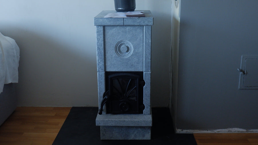 Etter rivingen ble det gamle hullet i gulvet nøye målt, og det ble bestilt en ny steinplate tilpasset akkurat dette. Steinplaten ble felt ned i eksisterende parkett – en ryddig og praktisk detalj som både sikrer brannsikkerhet og gir et helhetlig uttrykk. Oppå platen ble det montert en klebersteinsovn – kjent for å lagre varme over tid og gi jevn, behagelig oppvarming.