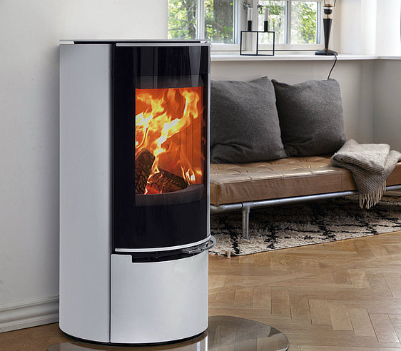 Denne vedovnen i kritthvitt skiller seg tydelig ut fra tradisjonelle modeller. Med avrundede former, integrerte detaljer og en diskret sokkel får du en ovn som kombinerer moderne design med høy ytelse. Det store frontglasset og de rene linjene gir rommet et lyst og rolig uttrykk.