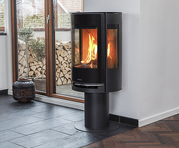 Aduro 9.3 Lux kombinerer funksjonalitet og design med sin elegante, slanke pidestall og store, buede glassdør. Ovnen gir et lett og moderne uttrykk og er utstyrt med svart glassdør, diskrete håndtak og en eksklusiv lukkemekanisme.