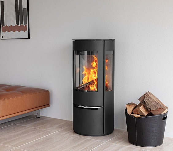 Aduro 15-serien kombinerer elegant ellipseform med bredt brennkammer og plass til vedkubber...